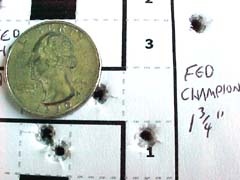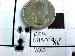"Before and after" pictures of groups fired with federal Champion ammo show the dramatic accuracy improvement possible with Paco Kelly's ACU'RZR tool.