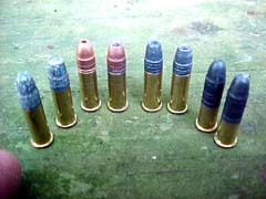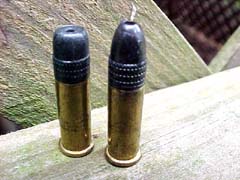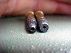 When first learning to use the ACU'RZR, I had a tendency to whack the ramrod with the hammer too hard, as can be seen by the radical reformation of the bullet nose in the accompanying photos. I soon learned that it was unnecessary to reform the bullet this drastically to achieve an increase in bullet diameter. While the radically reformed bullets worked well in the Marlin rifle and the Smith revolver, they would not feed in the auto pistol or the 581 bolt gun.