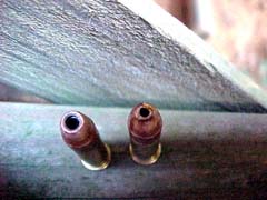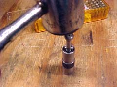 To use the tool, a .22 Rimfire cartridge, whether it be .22 Short, Long, or Long Rifle, is inserted into the tool body, the ramrod placed into the opposite end, and the tool placed on a flat, hard surface. I used the wood surface of my loading bench, but a piece of plate glass or smooth steel can also be used. Next, the head of the ramrod is gently whacked with a mallet. This process bumps up the diameter of the soft lead bullet and makes a dimple, or cupped area, on the nose of the bullet. The bullet now fits snugly into the chamber, and the bullet has a more efficient shape, to impart greater tissue damage to the target.