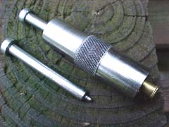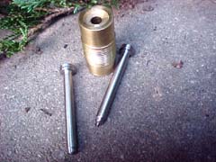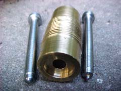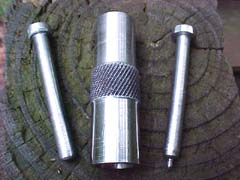 The tool consists of three simple parts; simple to use, that is, but painstakingly made to exacting tolerances. The main body of the tool is a round bar into which the .22 cartridge is inserted to have the bullet nose reformed and resized. The cartridge can be inserted into either end, with a resulting different bullet diameter, depending upon which end is selected. This gives the shooter a choice, depending upon the gun in which the cartridge will be fired. The other two pieces of the tool are the rods which actually reform the nose and diameter of the bullet. The only other tool needed is a mallet, in addition to a flat hard surface onto which the tool will be used. Since the tool has two distinct and different functions, we will address them separately.