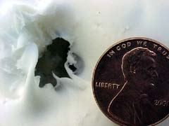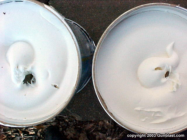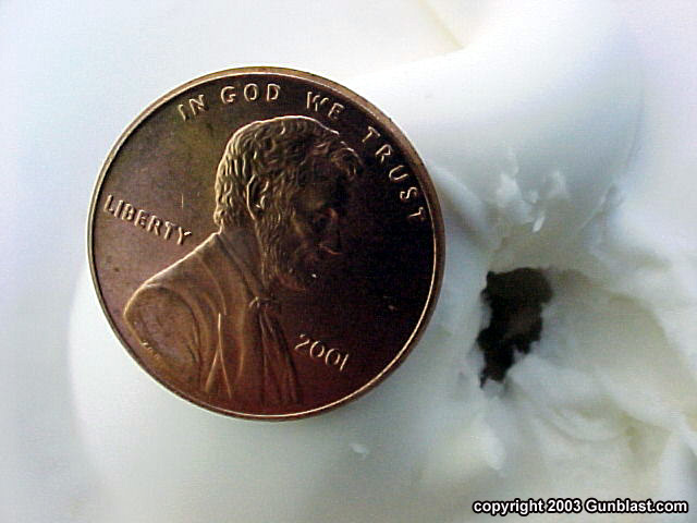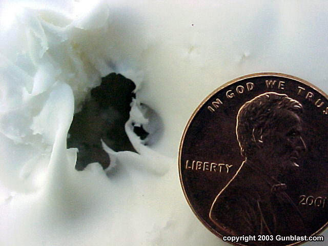 Shown at left is "entry wound" in shortening using the Baby Scorp'n bullet, and at right is the "entry wound" left by standard bullet.