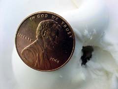 Shown with a penny for scale, at top is the hole left by Paco's Baby Scorp'n. The Baby Scorp'n bullets easily outperformed standard factory bullets (as shown by comparison of the standard bullet hole at bottom), and accuracy of factory bullets was measurably enhanced by the Baby Scorp'n tool.