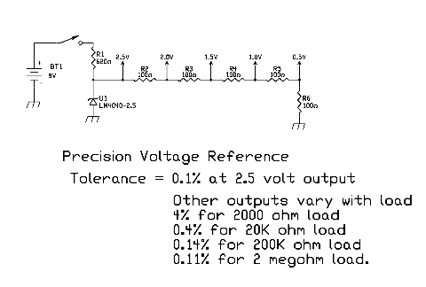 The LM4040-2.5 which I chose requires a minimum operating current of 60 microamps and a maximum operating current of 15 milliamps. I sized the series resistor (620 ohms) for a current of approximately 10 ma. so I could draw a small current without upsetting the operating parameters. I added a string of 100 ohm resistors to give me voltage steps at 0.5 volts increments. I hand selected these resistors from a pile and managed to find 5 resistors that measured right on 100 ohms with an ohmmeter calibrated at 0.1%. A reasonable alternative would be to use 1% resistors which would still yield a unit having an accuracy of 0.1% for the 2.5 volt output and a bit over 1% at the other voltage levels -- still good enough for most ham work.